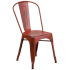 Brighten up your modern bistro, cafe or restaurant with some color while incorporating a trendy old world look into your design with the bistro style distressed red metal chair. To ensure a quality seating experience for your guests while they enjoy your drinks and other culinary delights, this industrial style metal restaurant chair features a supportive backrest and a comfortable seat. Made in a steel frame and finished in a distressed red powder coated texture, this bistro chair is both durable and artistic. The distressed red rubbed down finish protects the chair against rusting while adding a pop of color and complimenting our industrial series restaurant tables. Looking to coordinate your decor? Try our matching bar stools.