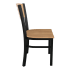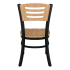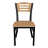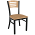 This metal chair with 3 slats in the back has a styllish look that will appeal to many restaurants, cafes and other venues. It has a look that will blend in with many types of decor, modern and traditional. There are many ways to customize your chair by choosing the finish for the strong metal frame which comes in standard black, by choosing the finish for the wood back and seat and choosing the seat option. The seat can either be cushioned with commercial grade foam and upholstered in vinyl or fabric with many oiptions to choose from or a solid wood seat. Constructed of fully welded 16-gauge steel with continuous root welds at stress points, this is a strong, durable chair built to withstand heavy traffic.